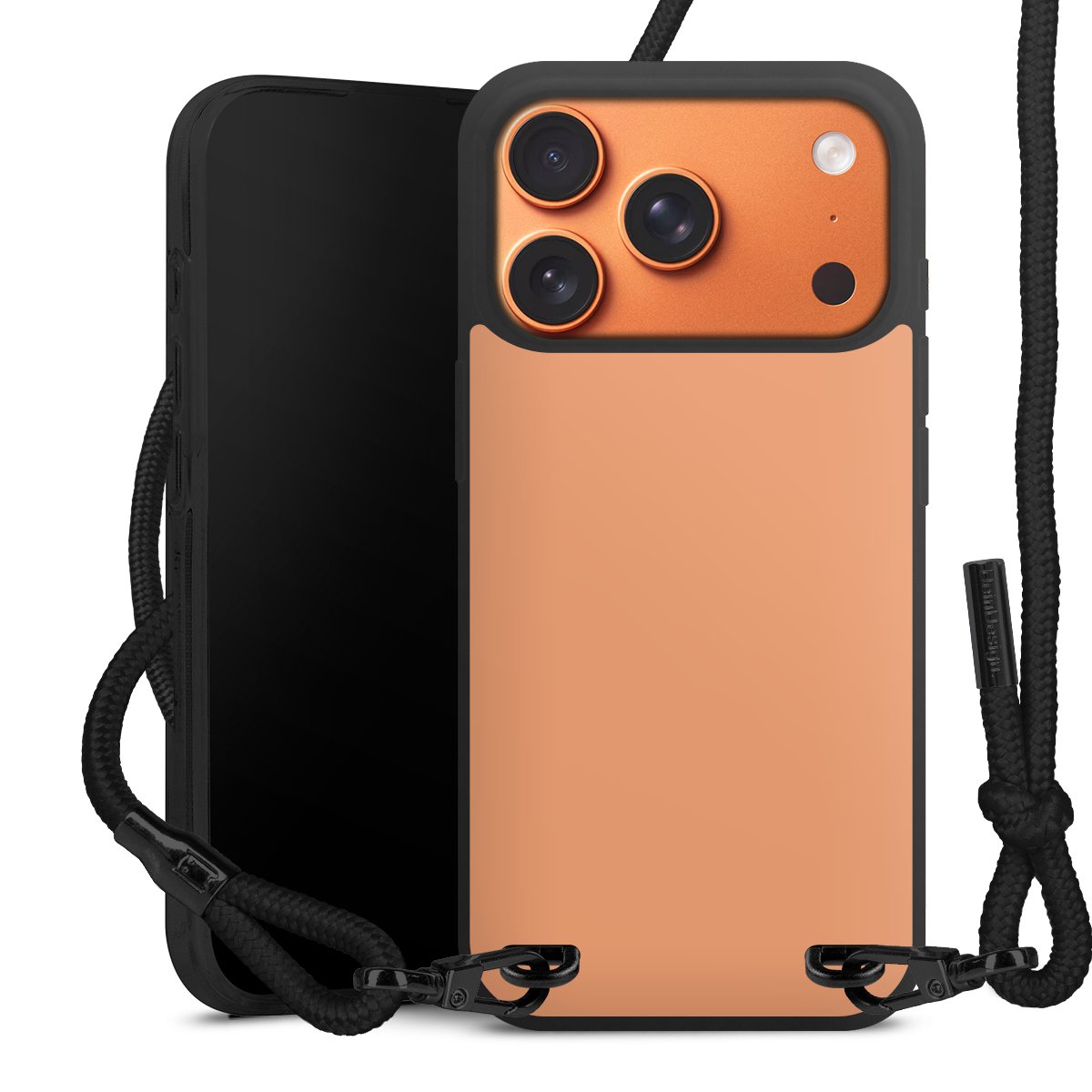 Pure Black: Handyhülle, Stoffband und Metalldetails in stylischem Mattschwarz.