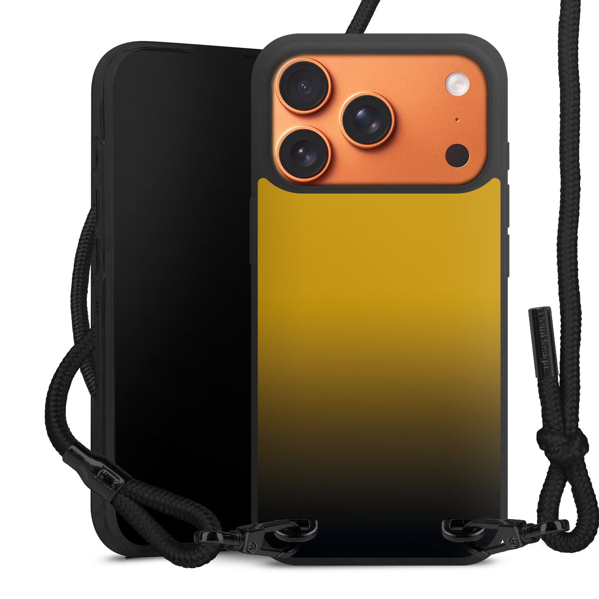 Pure Black: Handyhülle, Stoffband und Metalldetails in stylischem Mattschwarz.