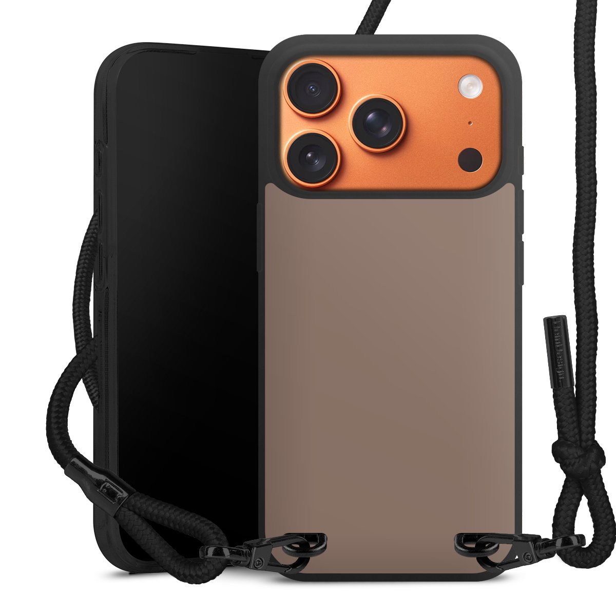 Pure Black: Handyhülle, Stoffband und Metalldetails in stylischem Mattschwarz.