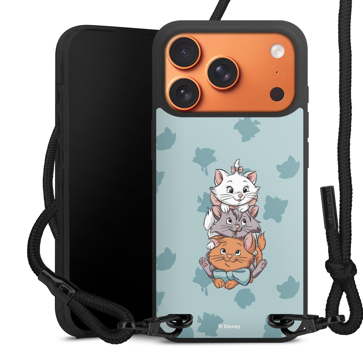 Pure Black: Handyhülle, Stoffband und Metalldetails in stylischem Mattschwarz.