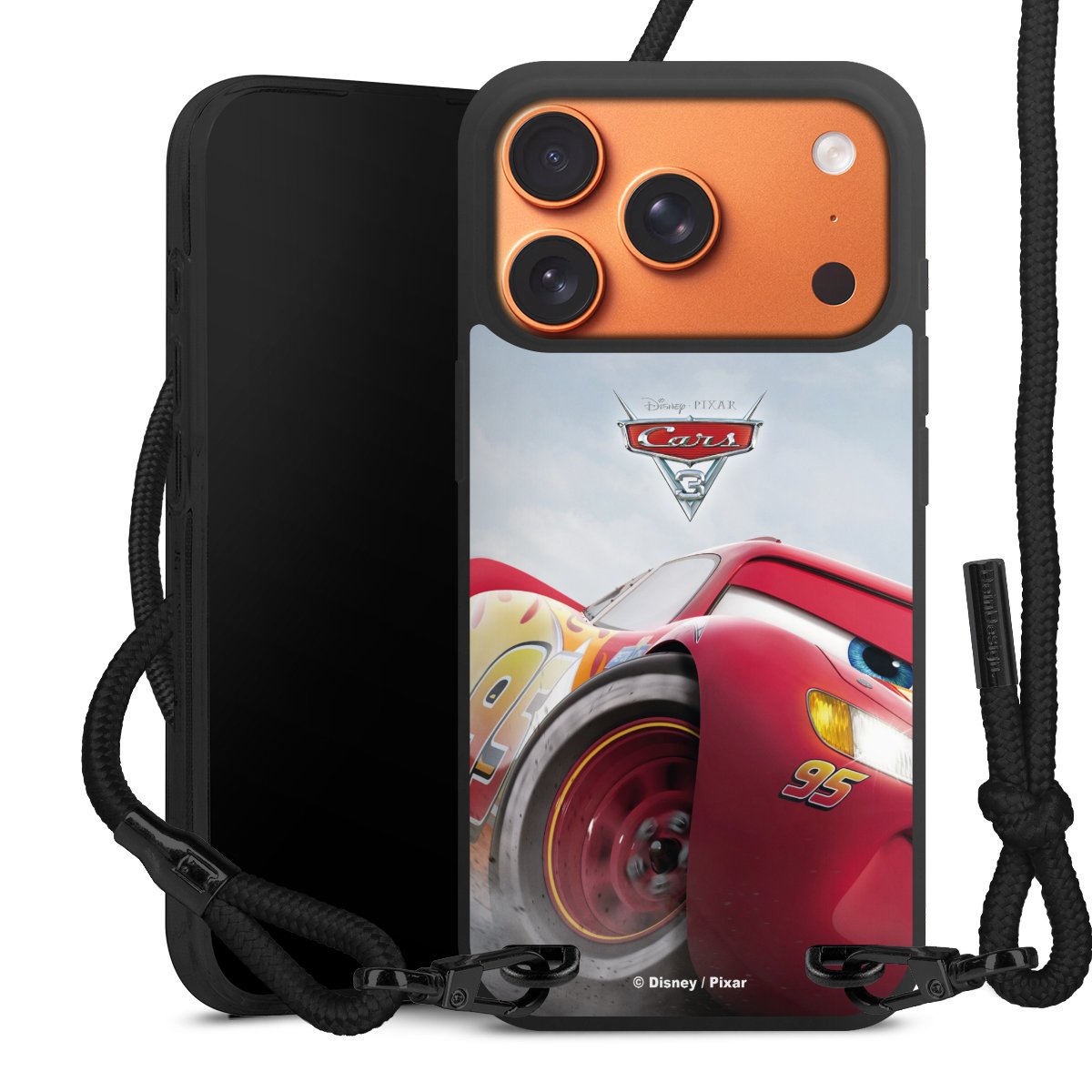 Pure Black: Handyhülle, Stoffband und Metalldetails in stylischem Mattschwarz.