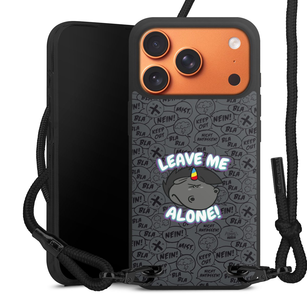 Pure Black: Handyhülle, Stoffband und Metalldetails in stylischem Mattschwarz.