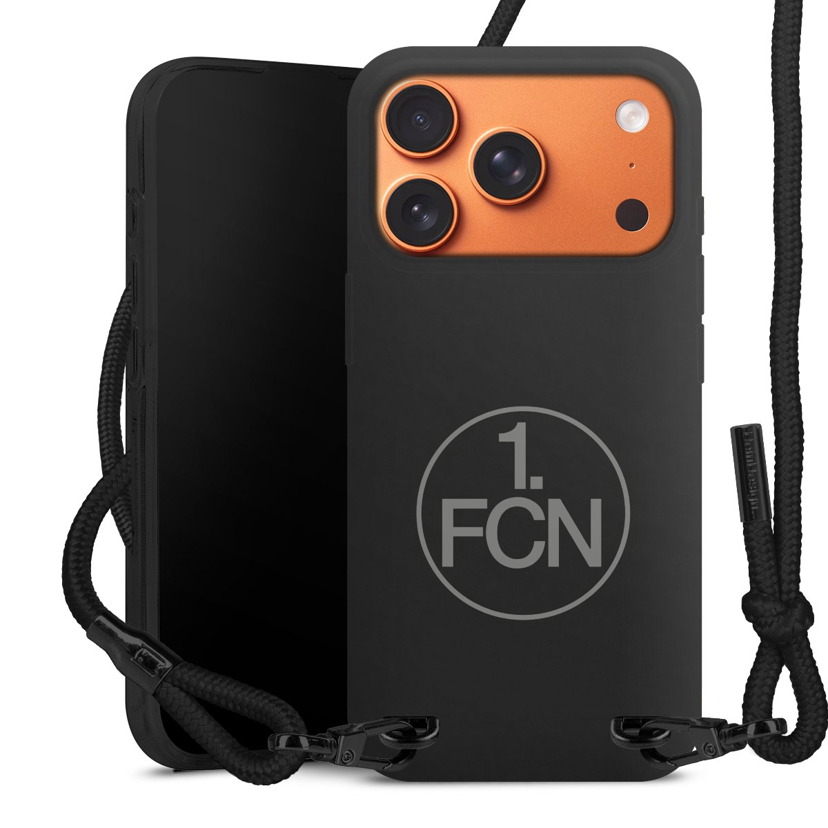 Pure Black: Handyhülle, Stoffband und Metalldetails in stylischem Mattschwarz.