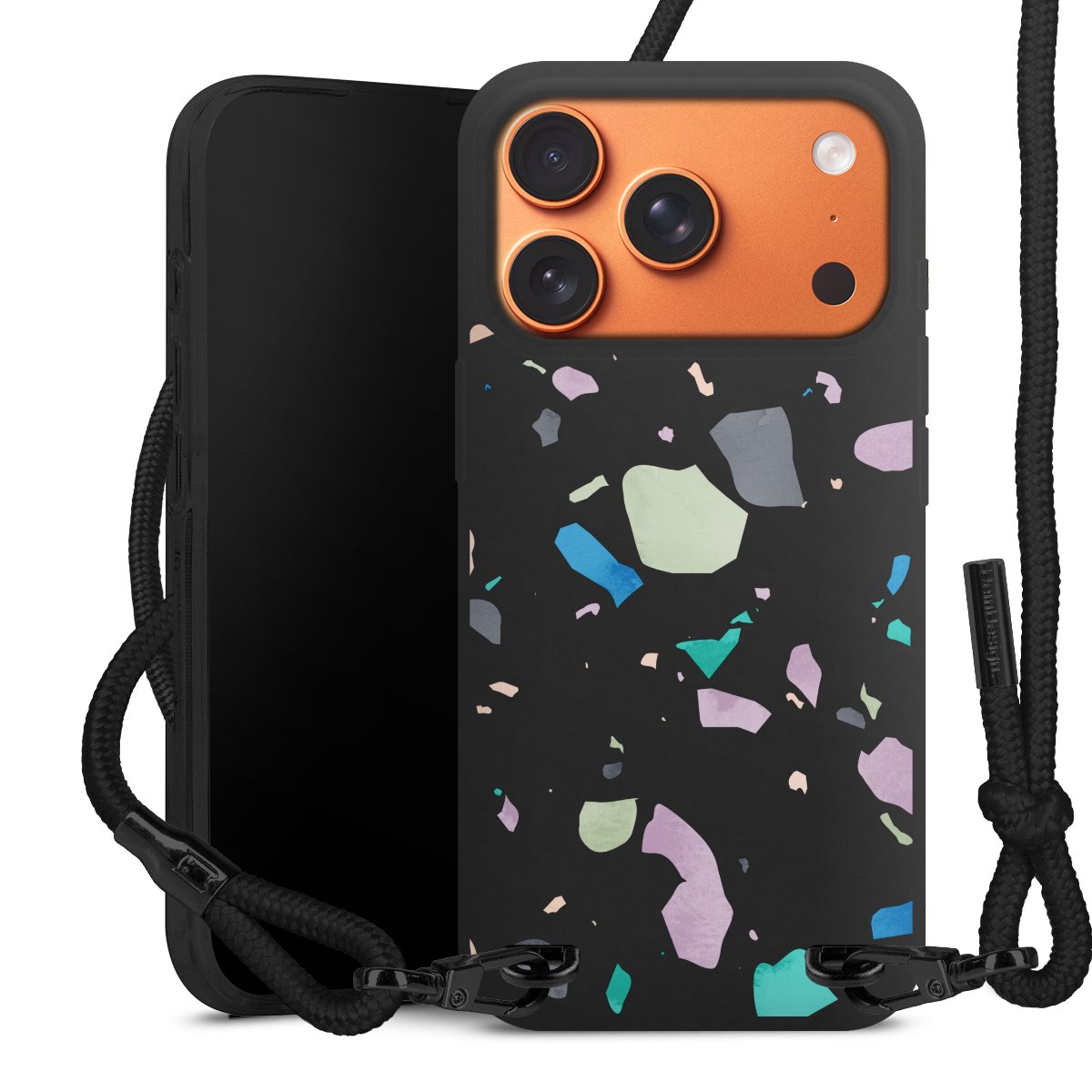 Pure Black: Handyhülle, Stoffband und Metalldetails in stylischem Mattschwarz.