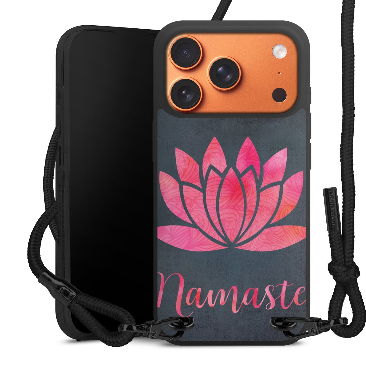 Pure Black: Handyhülle, Stoffband und Metalldetails in stylischem Mattschwarz.