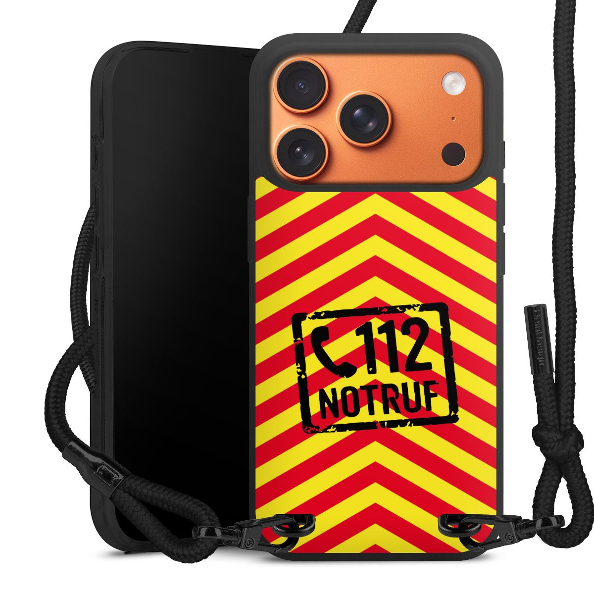 Pure Black: Handyhülle, Stoffband und Metalldetails in stylischem Mattschwarz.