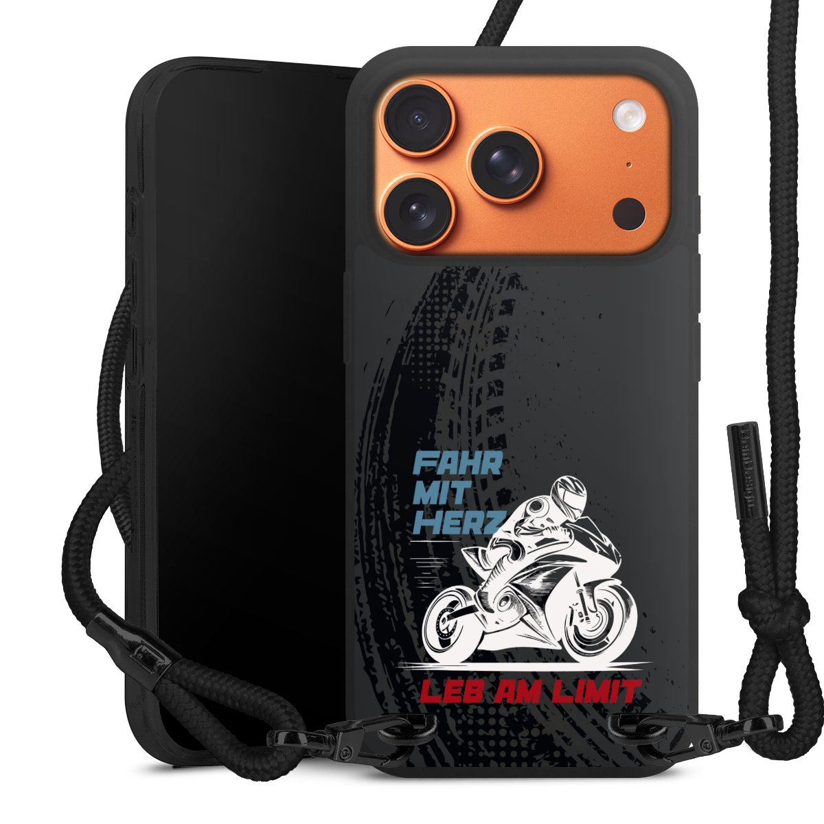 Pure Black: Handyhülle, Stoffband und Metalldetails in stylischem Mattschwarz.