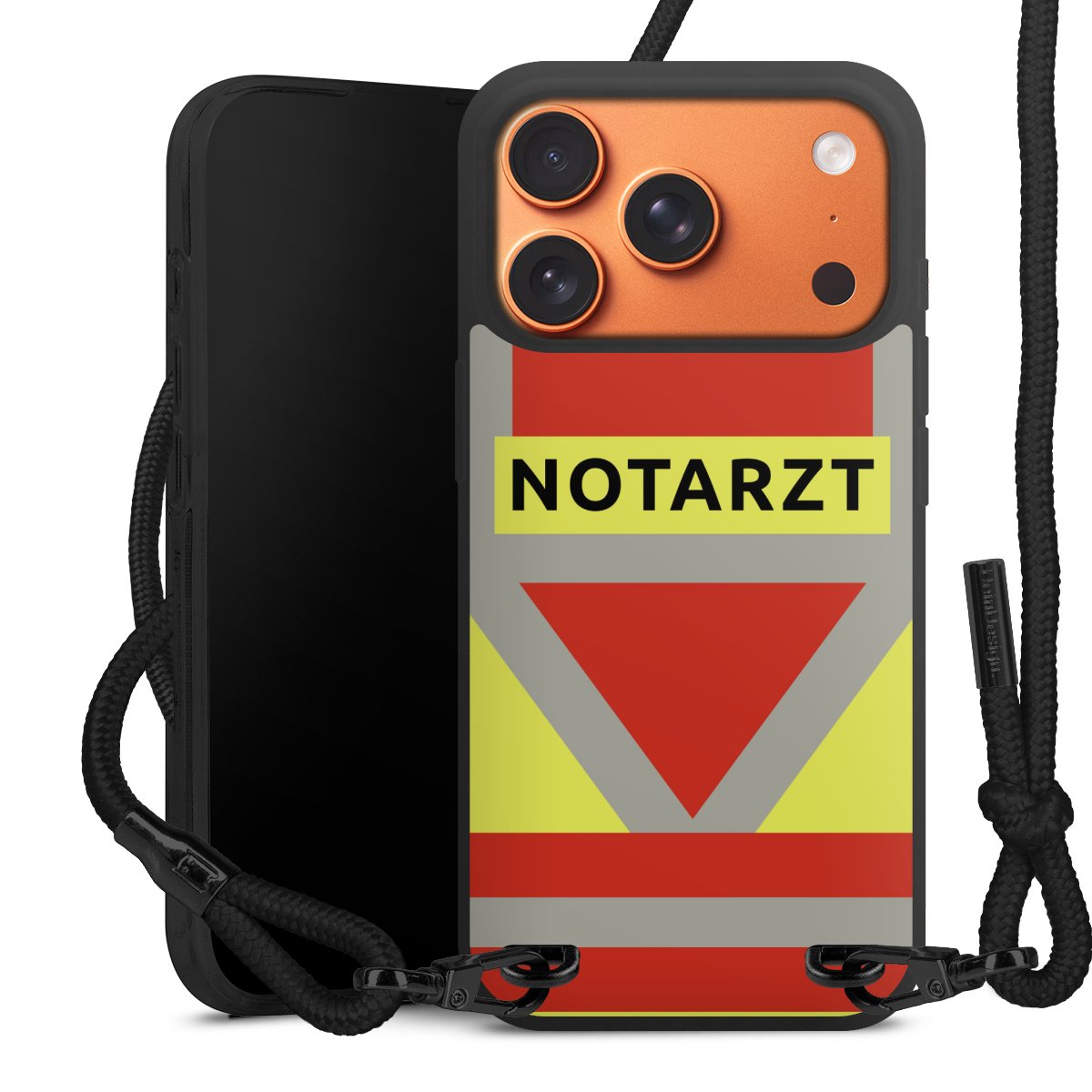 Pure Black: Handyhülle, Stoffband und Metalldetails in stylischem Mattschwarz.