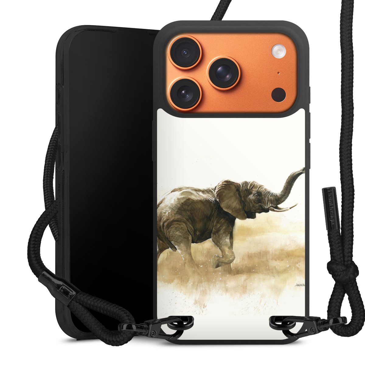 Pure Black: Handyhülle, Stoffband und Metalldetails in stylischem Mattschwarz.