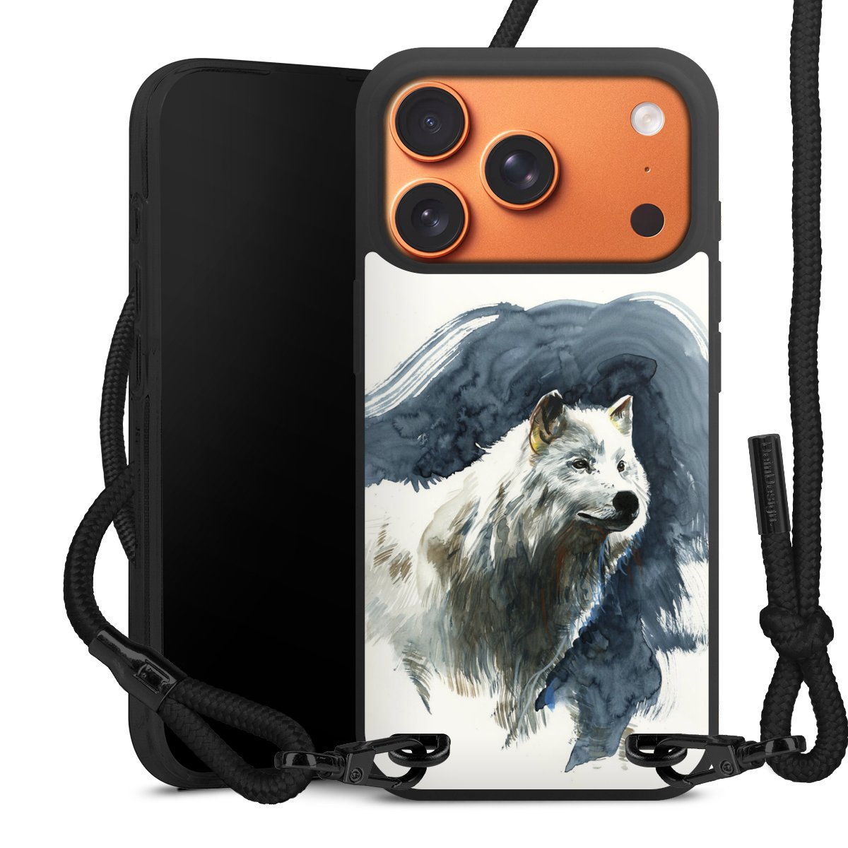 Pure Black: Handyhülle, Stoffband und Metalldetails in stylischem Mattschwarz.