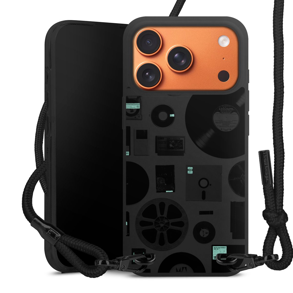 Pure Black: Handyhülle, Stoffband und Metalldetails in stylischem Mattschwarz.