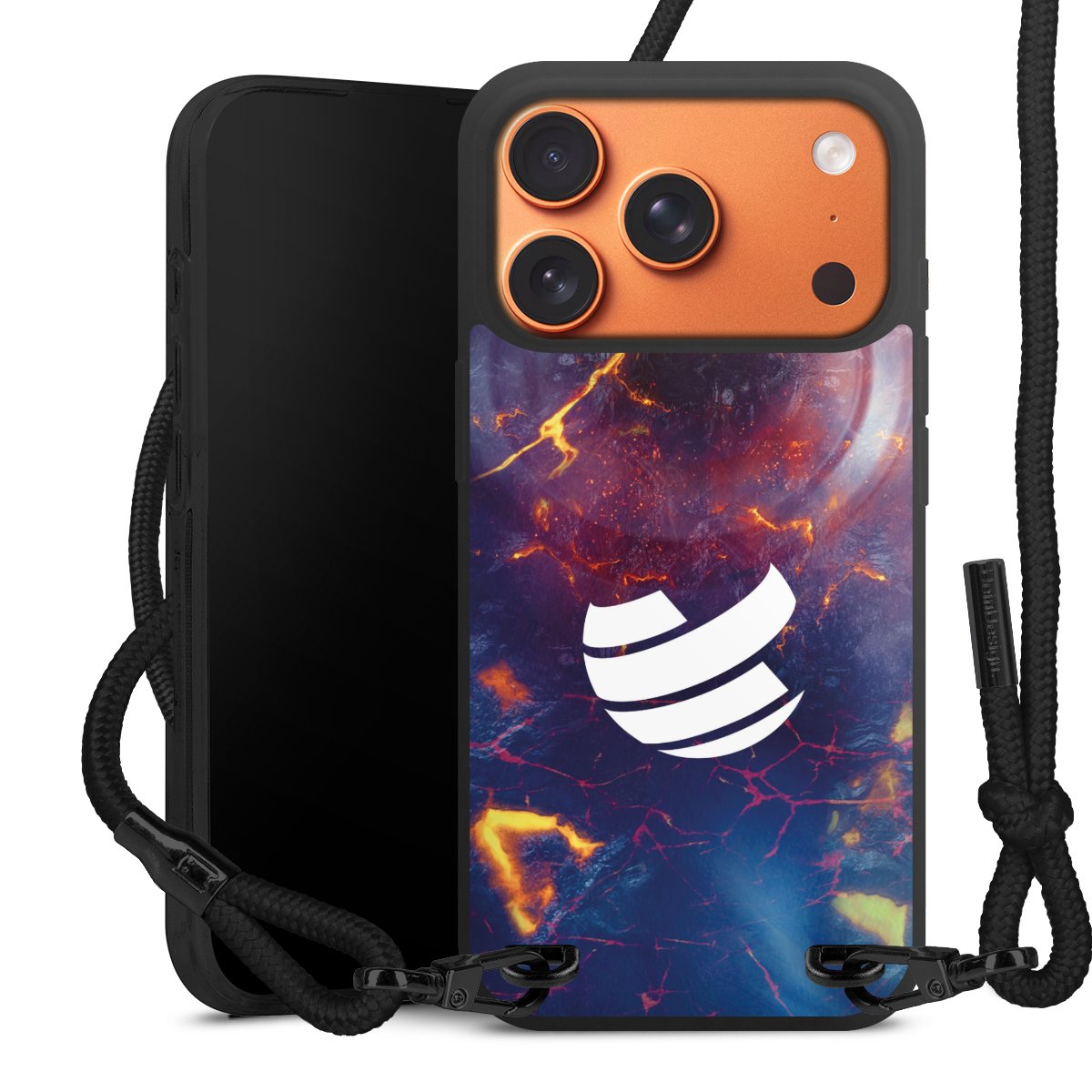 Pure Black: Handyhülle, Stoffband und Metalldetails in stylischem Mattschwarz.