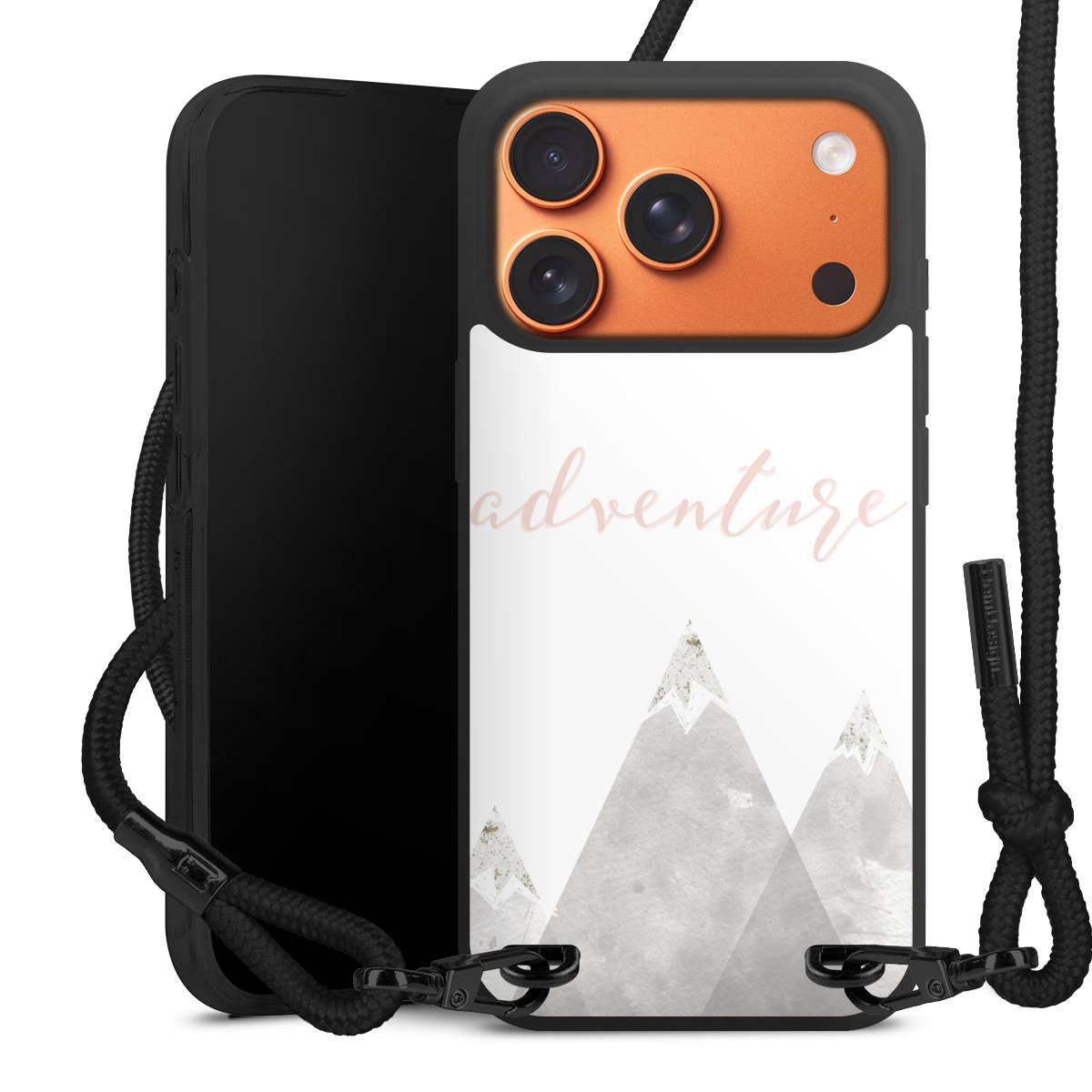 Pure Black: Handyhülle, Stoffband und Metalldetails in stylischem Mattschwarz.
