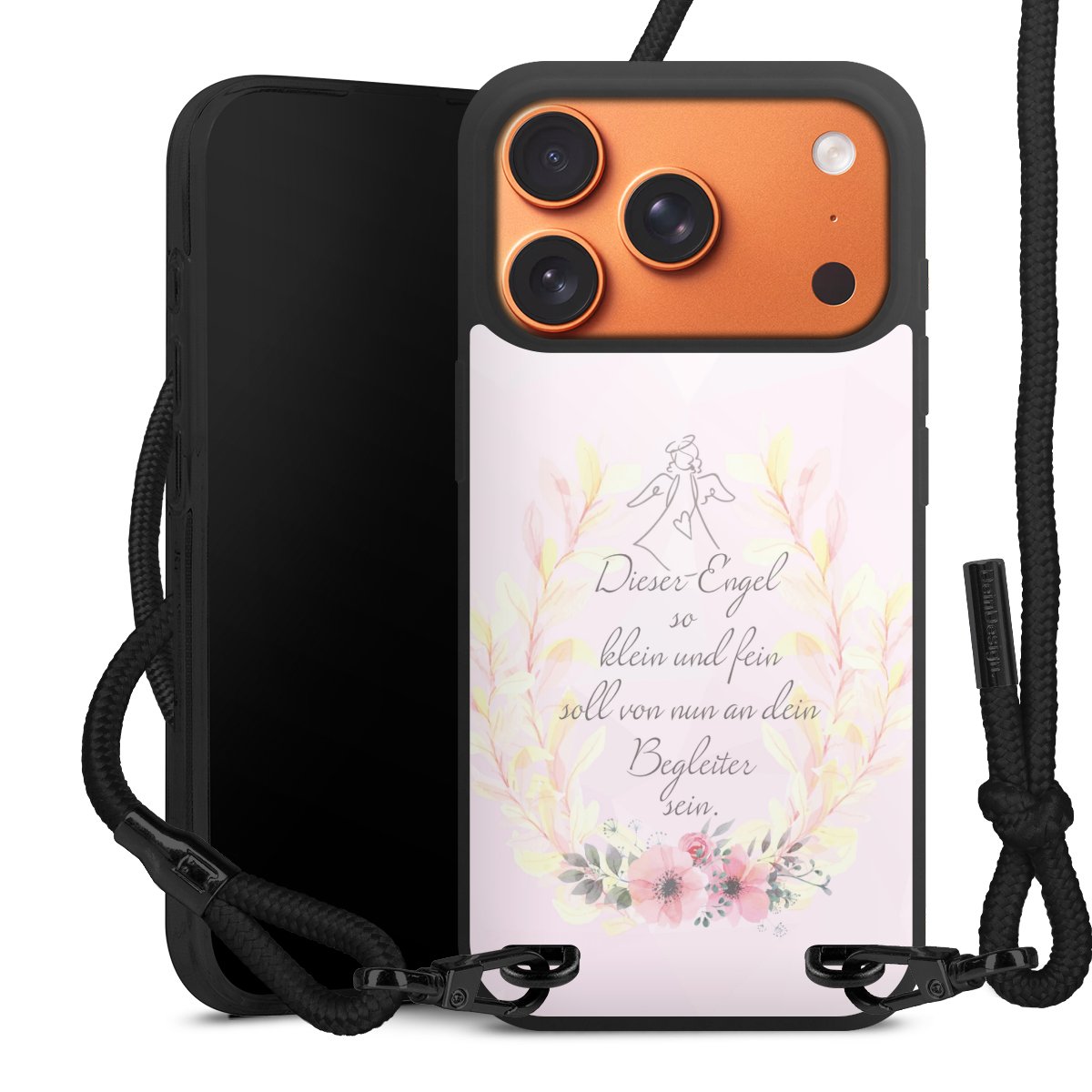 Pure Black: Handyhülle, Stoffband und Metalldetails in stylischem Mattschwarz.
