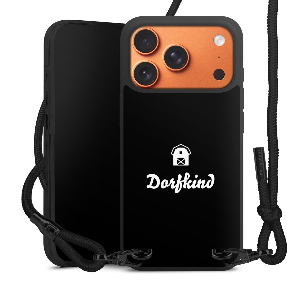 Pure Black: Handyhülle, Stoffband und Metalldetails in stylischem Mattschwarz.