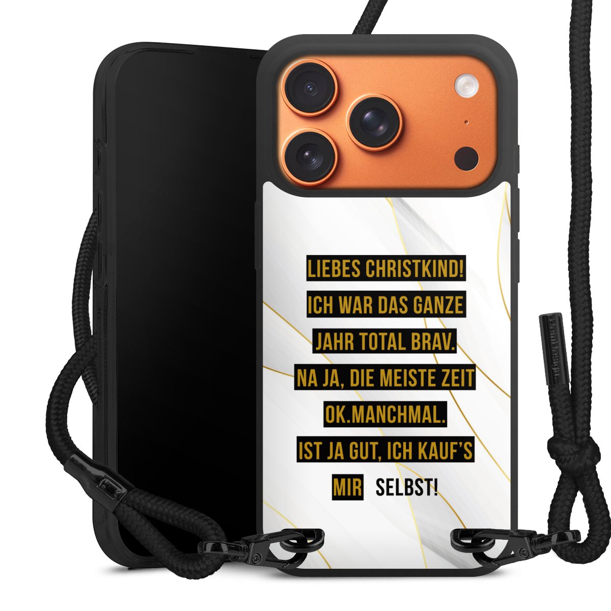 Pure Black: Handyhülle, Stoffband und Metalldetails in stylischem Mattschwarz.