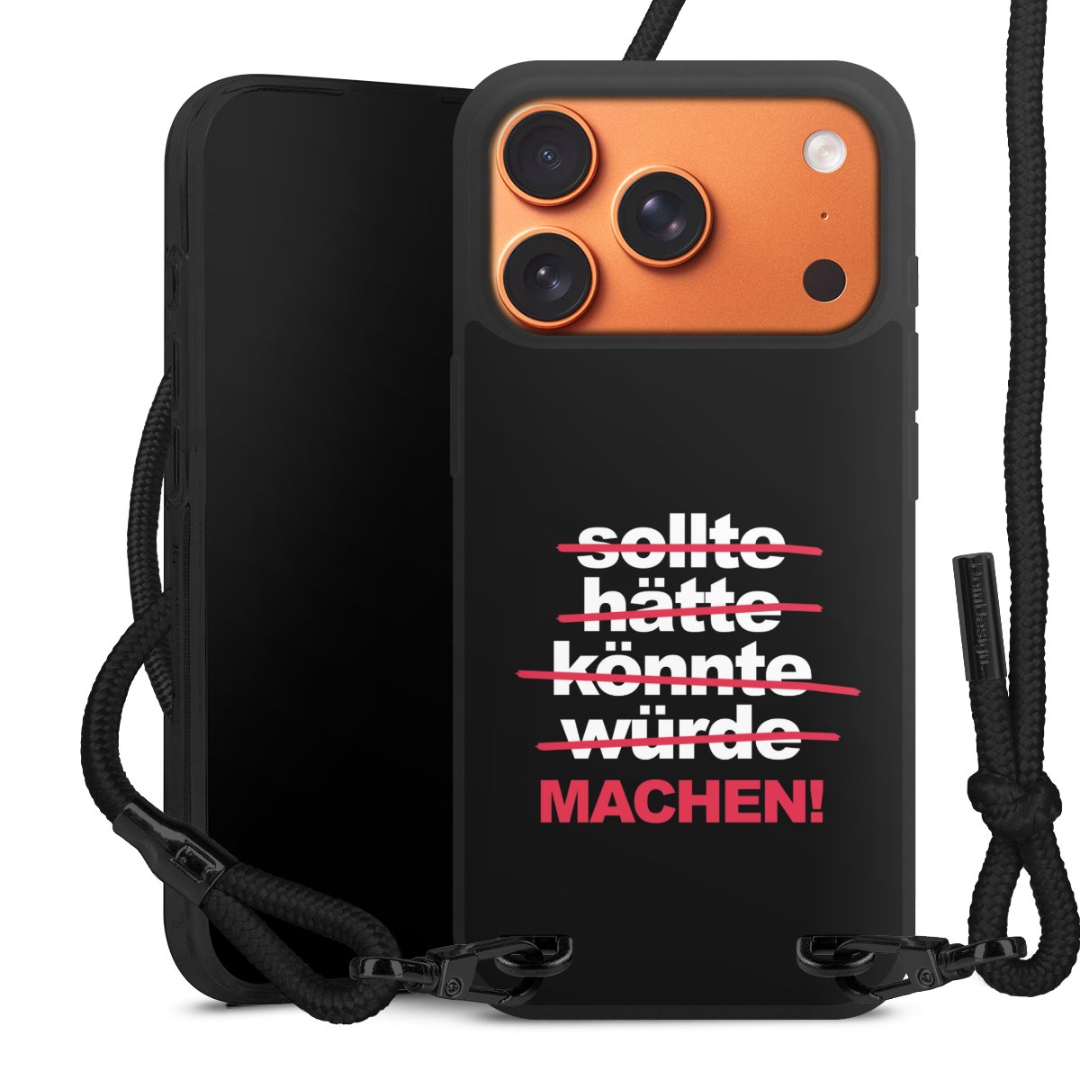 Pure Black: Handyhülle, Stoffband und Metalldetails in stylischem Mattschwarz.