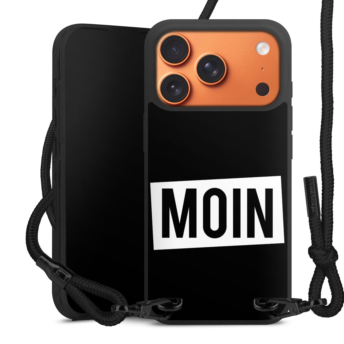 Pure Black: Handyhülle, Stoffband und Metalldetails in stylischem Mattschwarz.