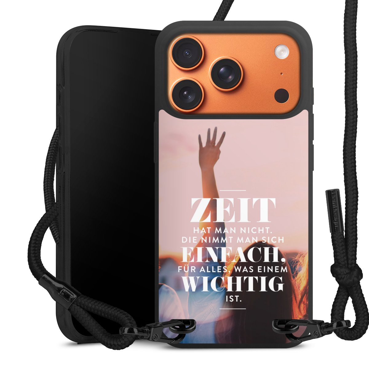 Pure Black: Handyhülle, Stoffband und Metalldetails in stylischem Mattschwarz.