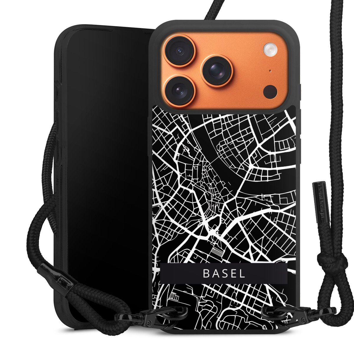 Pure Black: Handyhülle, Stoffband und Metalldetails in stylischem Mattschwarz.