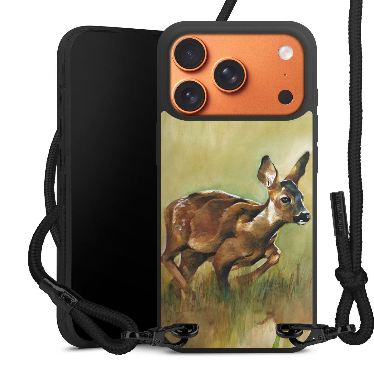 Pure Black: Handyhülle, Stoffband und Metalldetails in stylischem Mattschwarz.