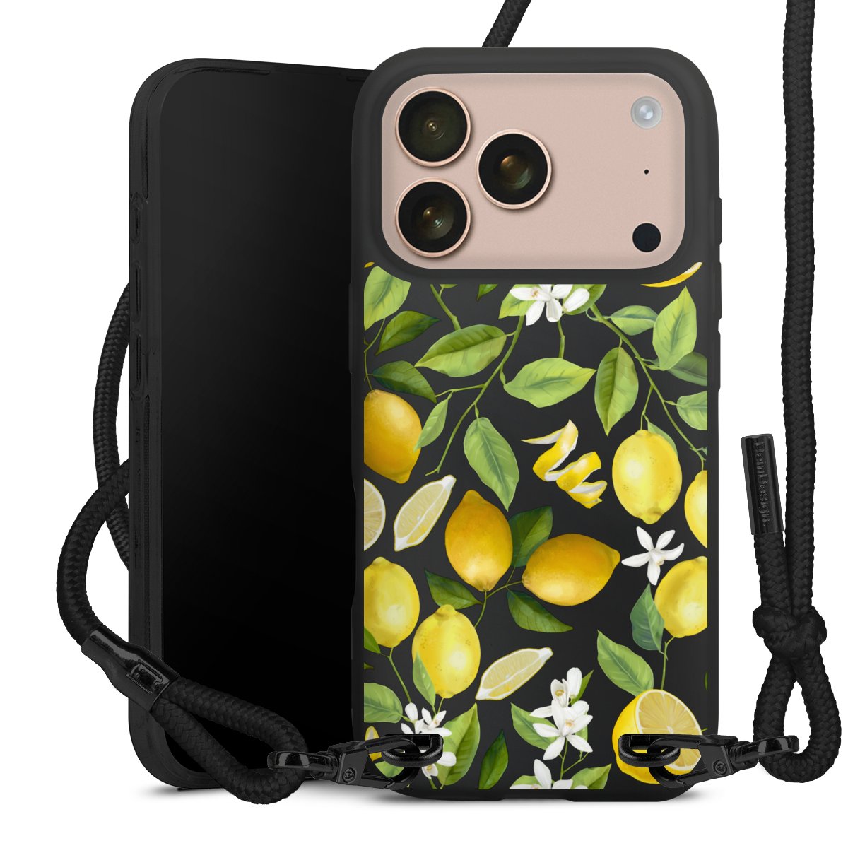 Pure Black: Handyhülle, Stoffband und Metalldetails in stylischem Mattschwarz.