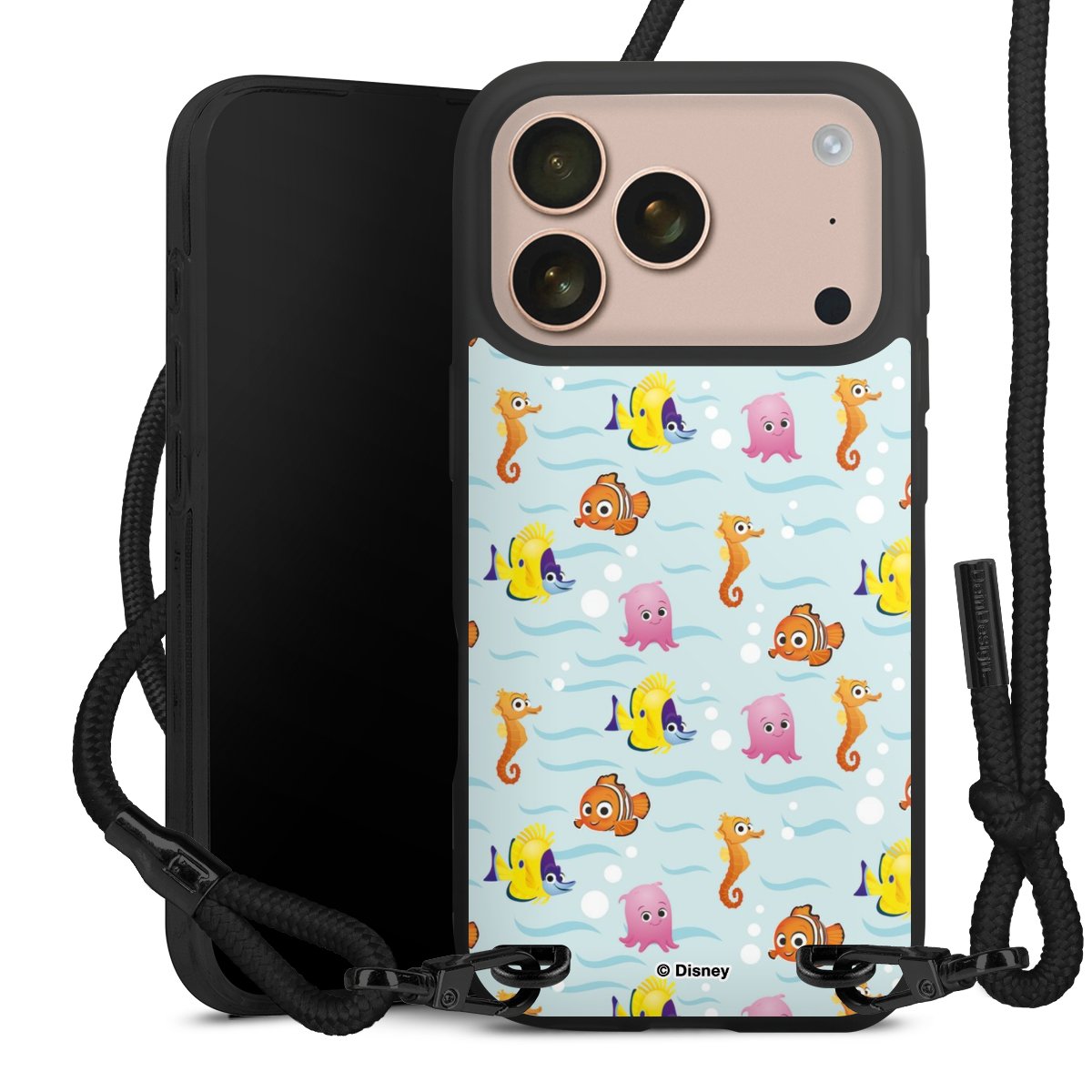 Pure Black: Handyhülle, Stoffband und Metalldetails in stylischem Mattschwarz.