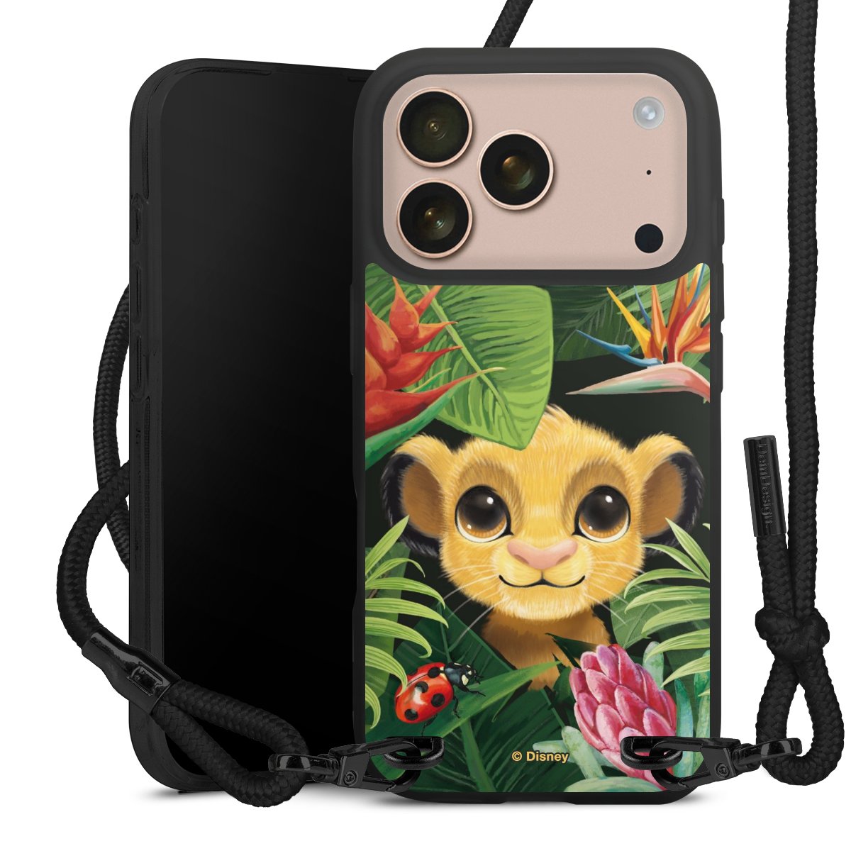 Pure Black: Handyhülle, Stoffband und Metalldetails in stylischem Mattschwarz.