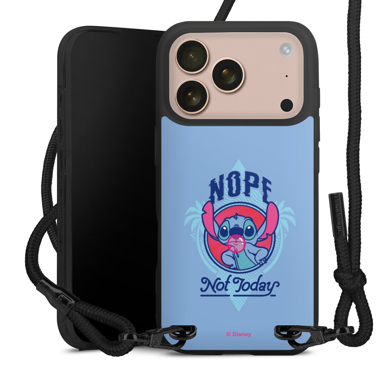 Pure Black: Handyhülle, Stoffband und Metalldetails in stylischem Mattschwarz.