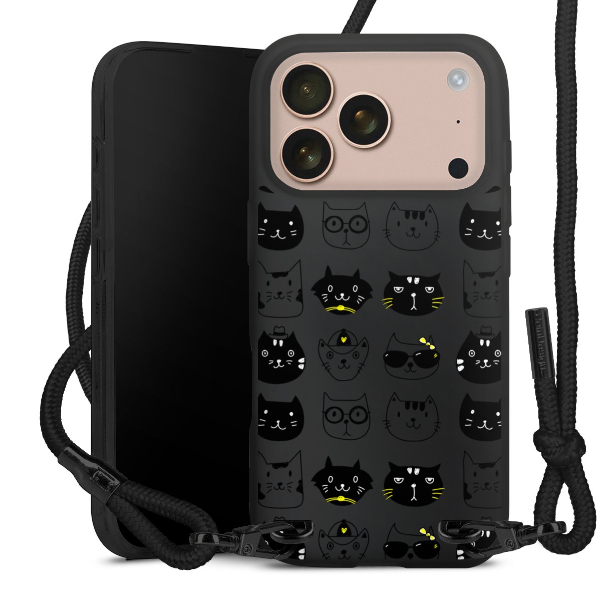 Pure Black: Handyhülle, Stoffband und Metalldetails in stylischem Mattschwarz.