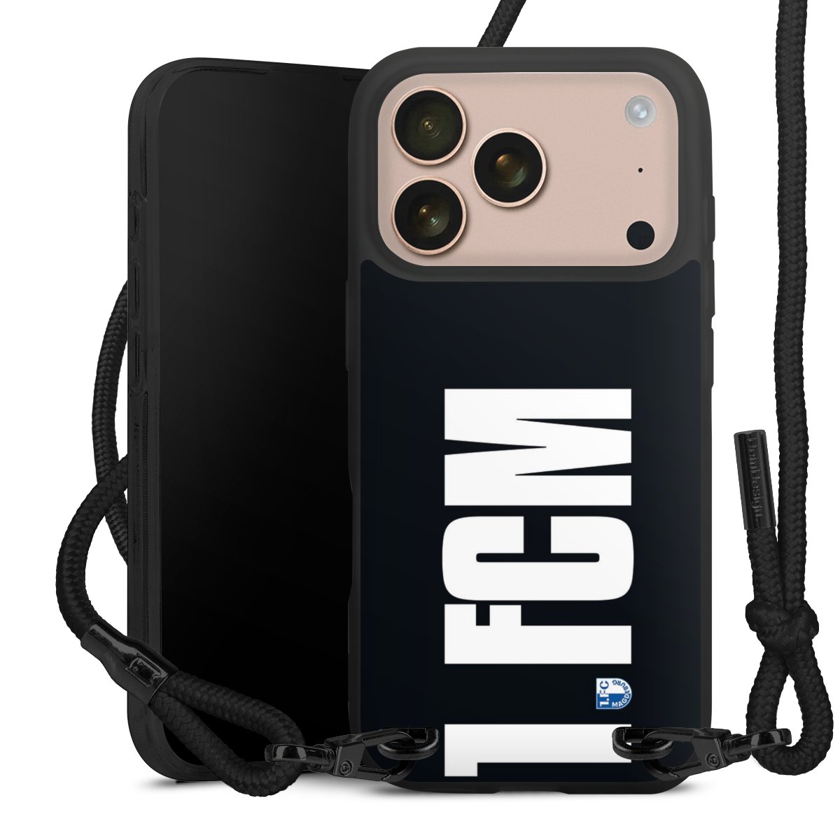 Pure Black: Handyhülle, Stoffband und Metalldetails in stylischem Mattschwarz.