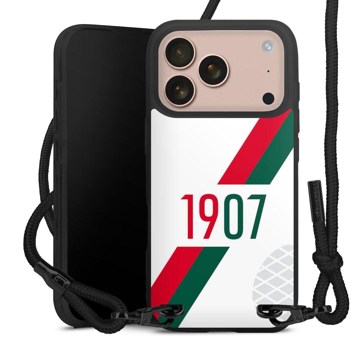 Pure Black: Handyhülle, Stoffband und Metalldetails in stylischem Mattschwarz.