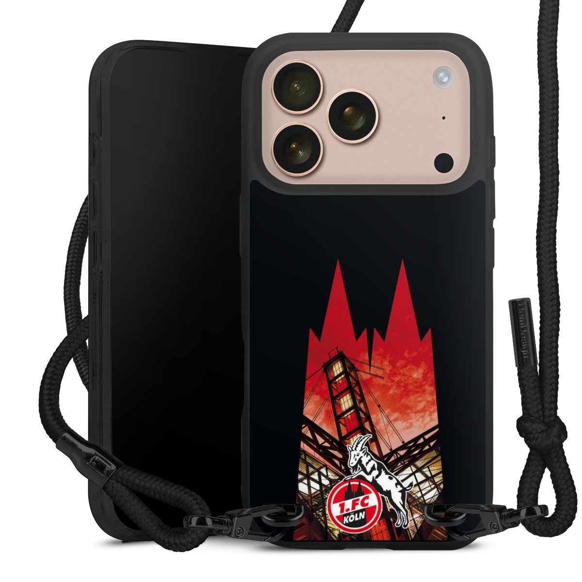 Pure Black: Handyhülle, Stoffband und Metalldetails in stylischem Mattschwarz.