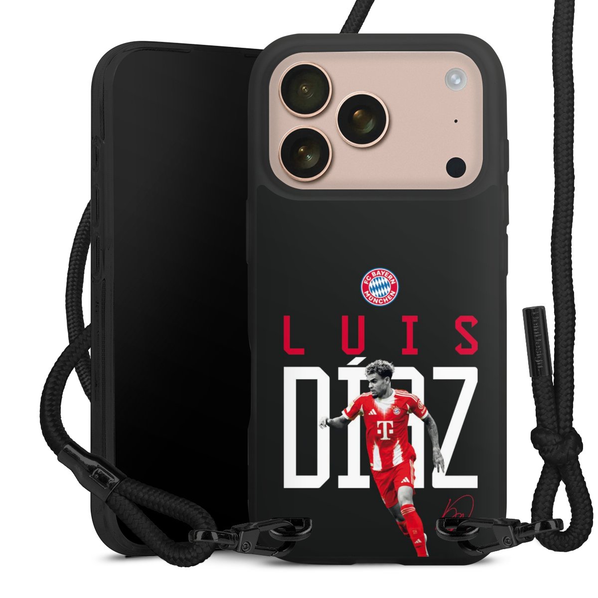 Pure Black: Handyhülle, Stoffband und Metalldetails in stylischem Mattschwarz.