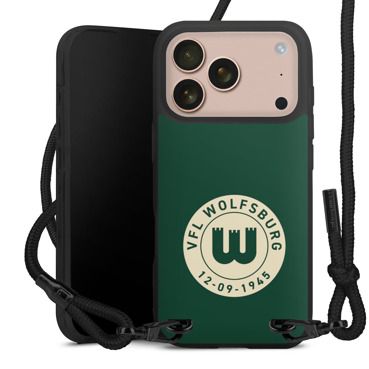 Pure Black: Handyhülle, Stoffband und Metalldetails in stylischem Mattschwarz.