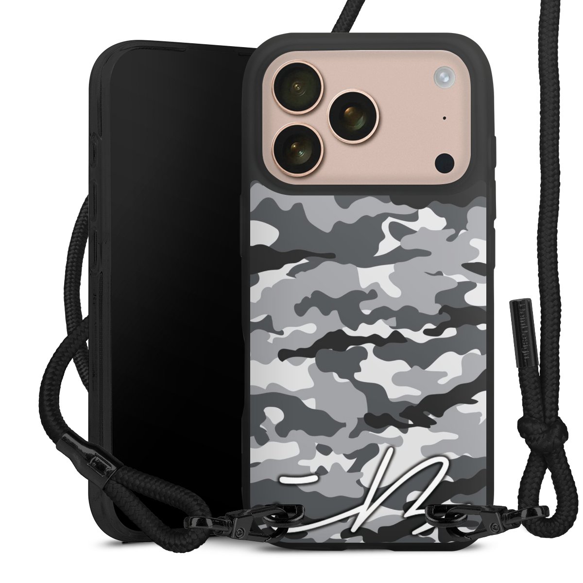 Pure Black: Handyhülle, Stoffband und Metalldetails in stylischem Mattschwarz.