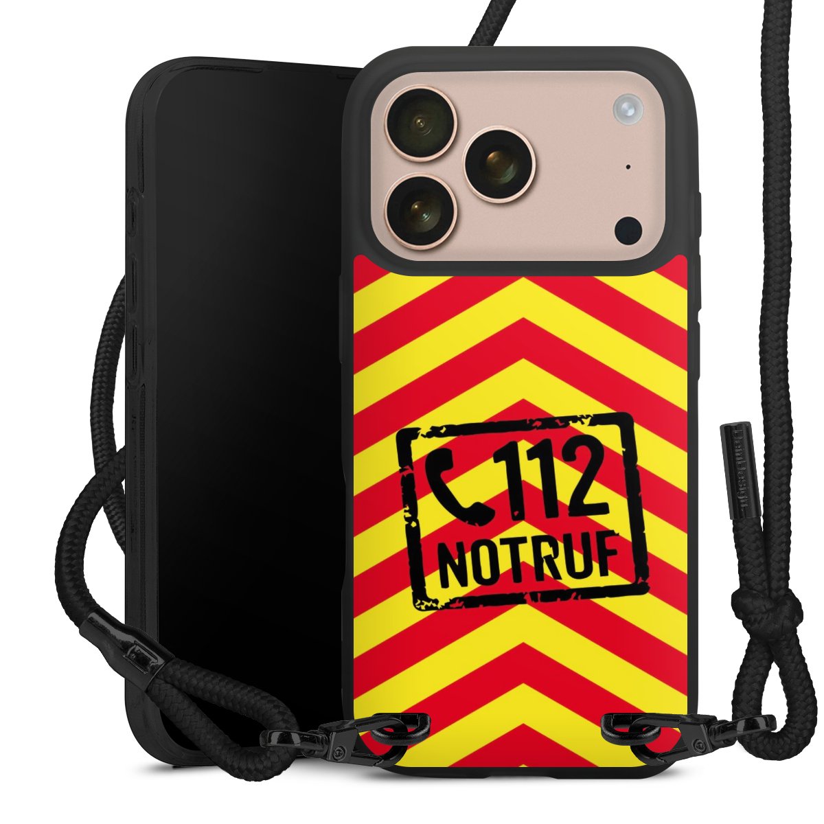 Pure Black: Handyhülle, Stoffband und Metalldetails in stylischem Mattschwarz.