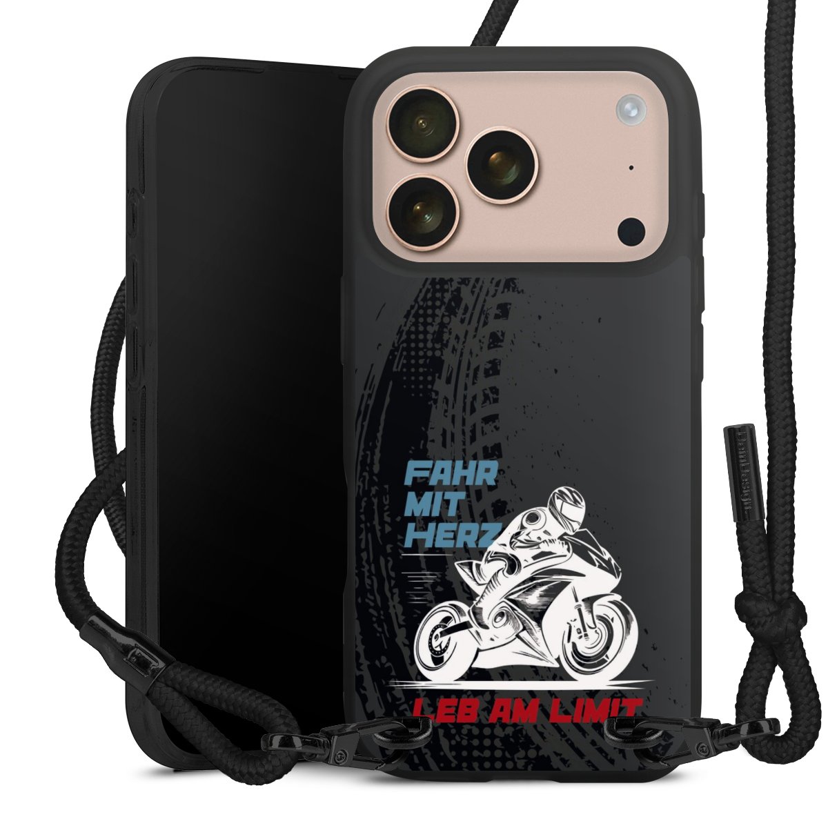 Pure Black: Handyhülle, Stoffband und Metalldetails in stylischem Mattschwarz.