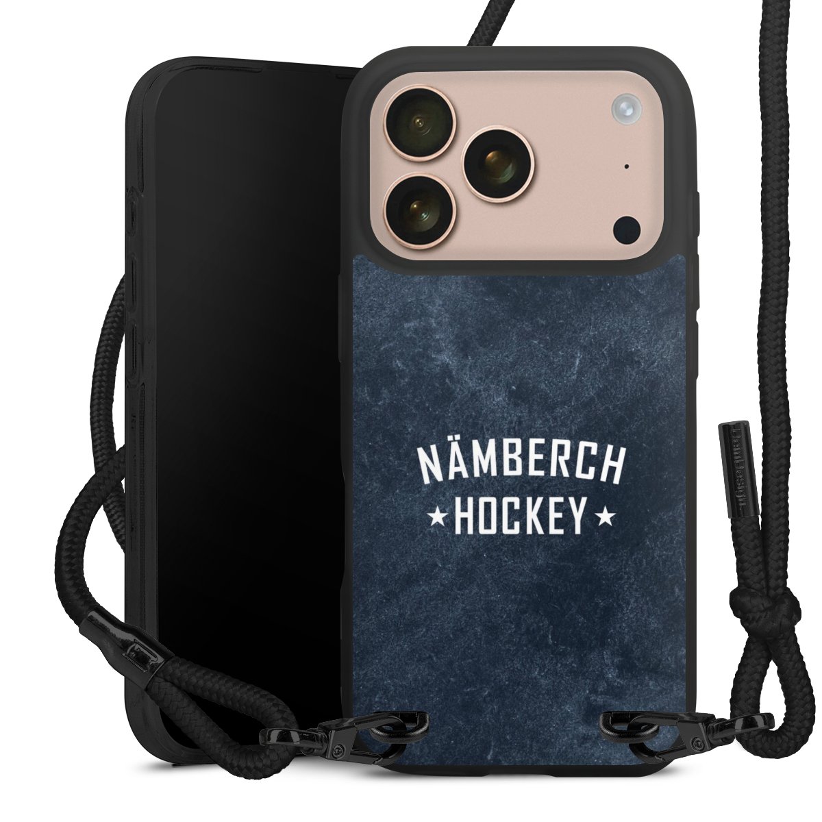 Pure Black: Handyhülle, Stoffband und Metalldetails in stylischem Mattschwarz.