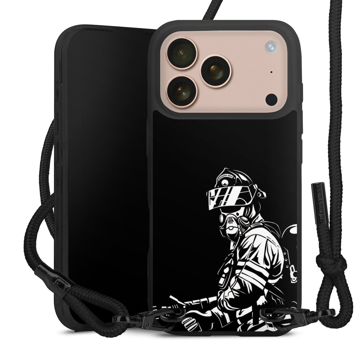 Pure Black: Handyhülle, Stoffband und Metalldetails in stylischem Mattschwarz.