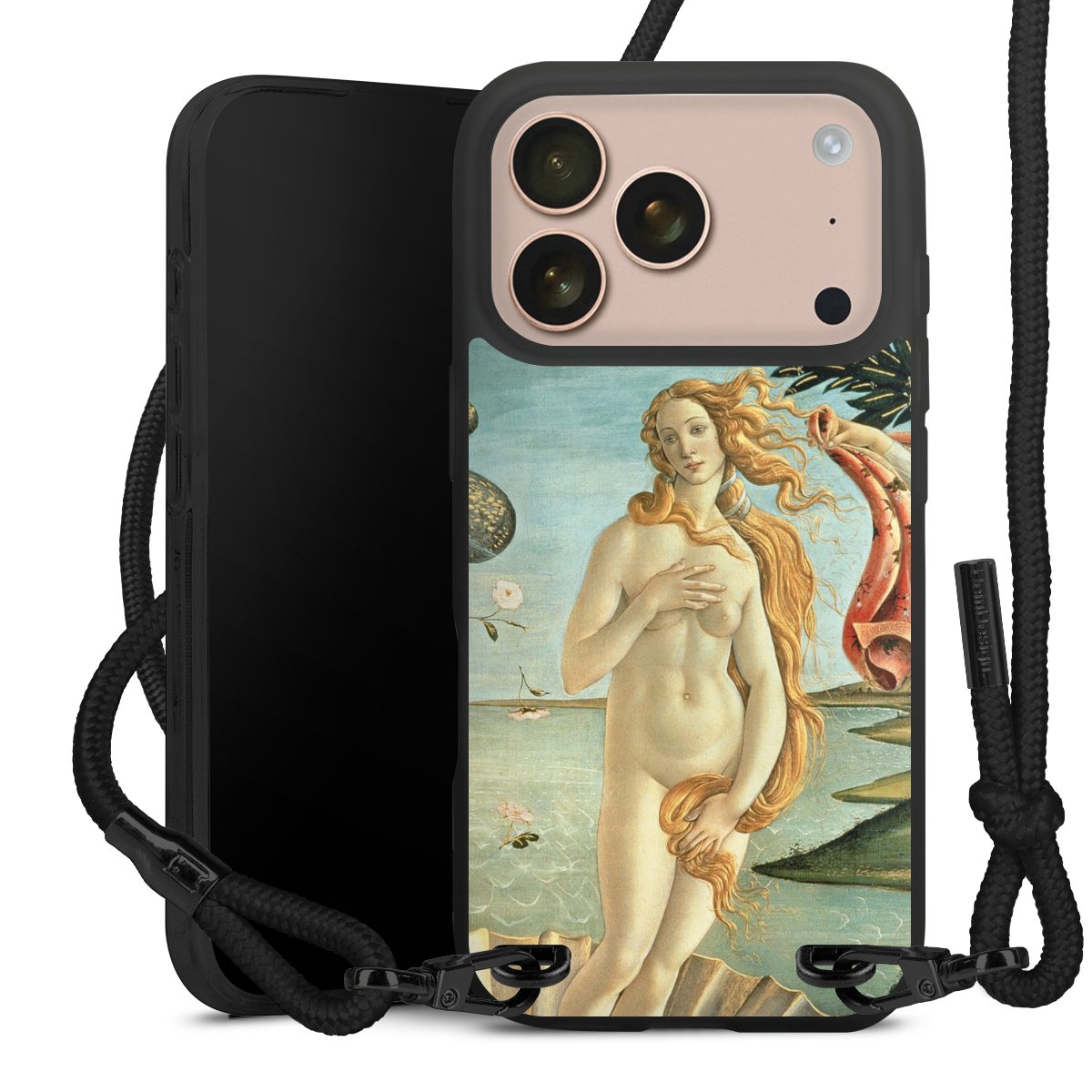 Pure Black: Handyhülle, Stoffband und Metalldetails in stylischem Mattschwarz.