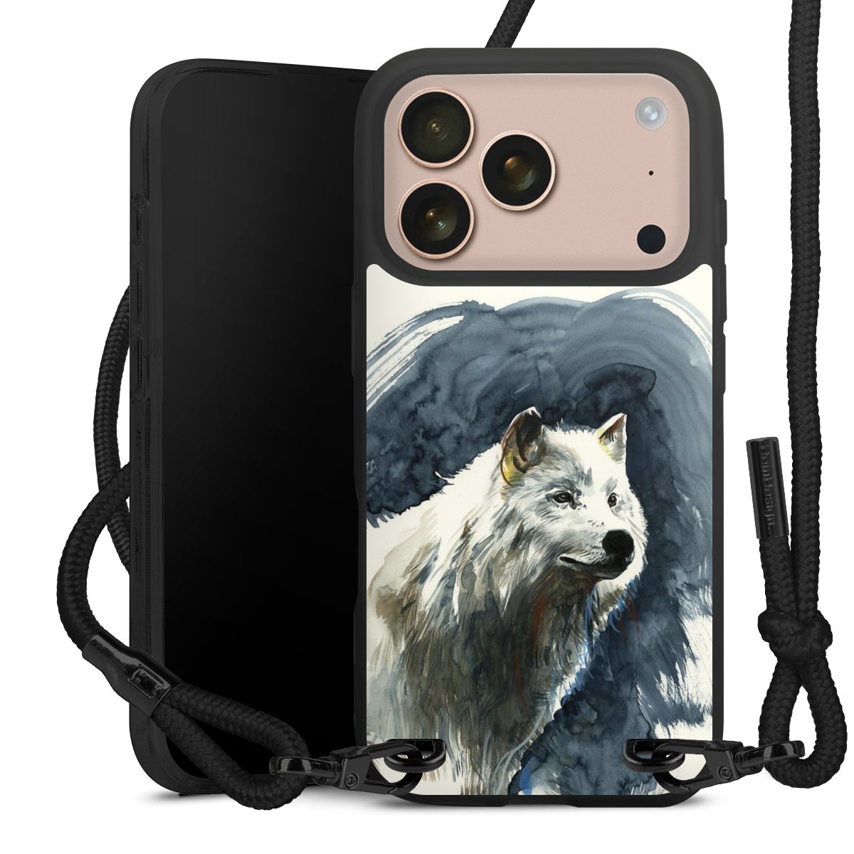 Pure Black: Handyhülle, Stoffband und Metalldetails in stylischem Mattschwarz.