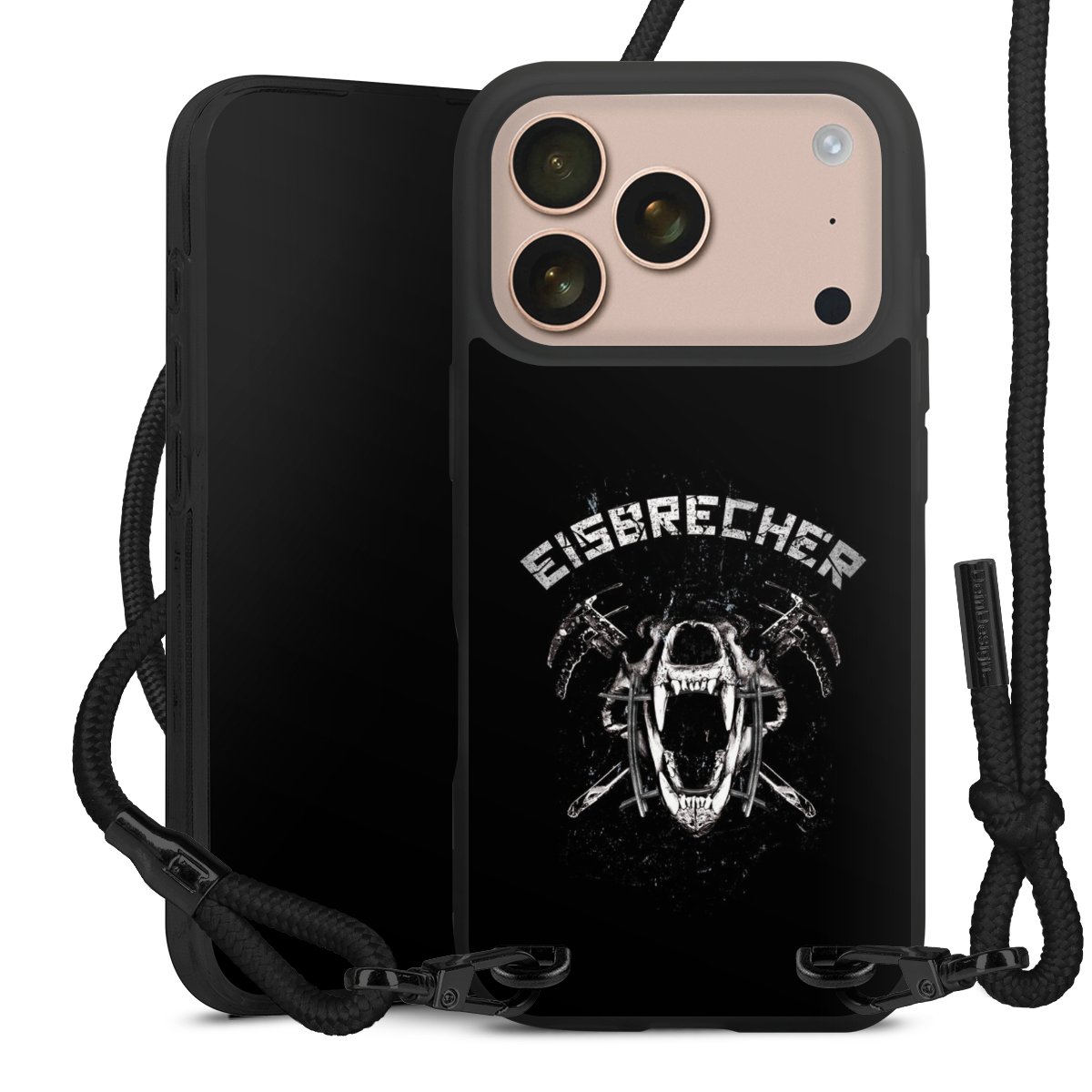 Pure Black: Handyhülle, Stoffband und Metalldetails in stylischem Mattschwarz.