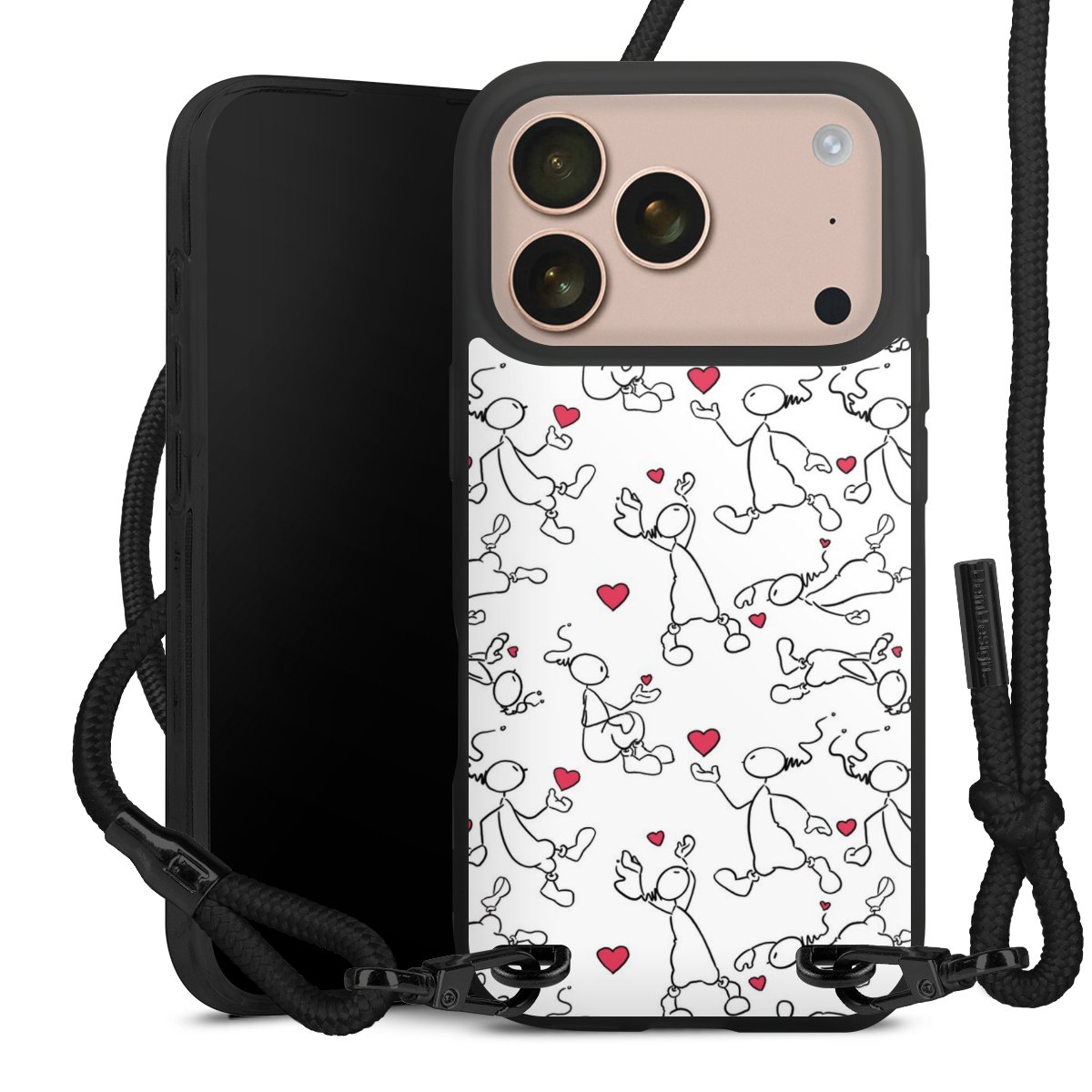 Pure Black: Handyhülle, Stoffband und Metalldetails in stylischem Mattschwarz.