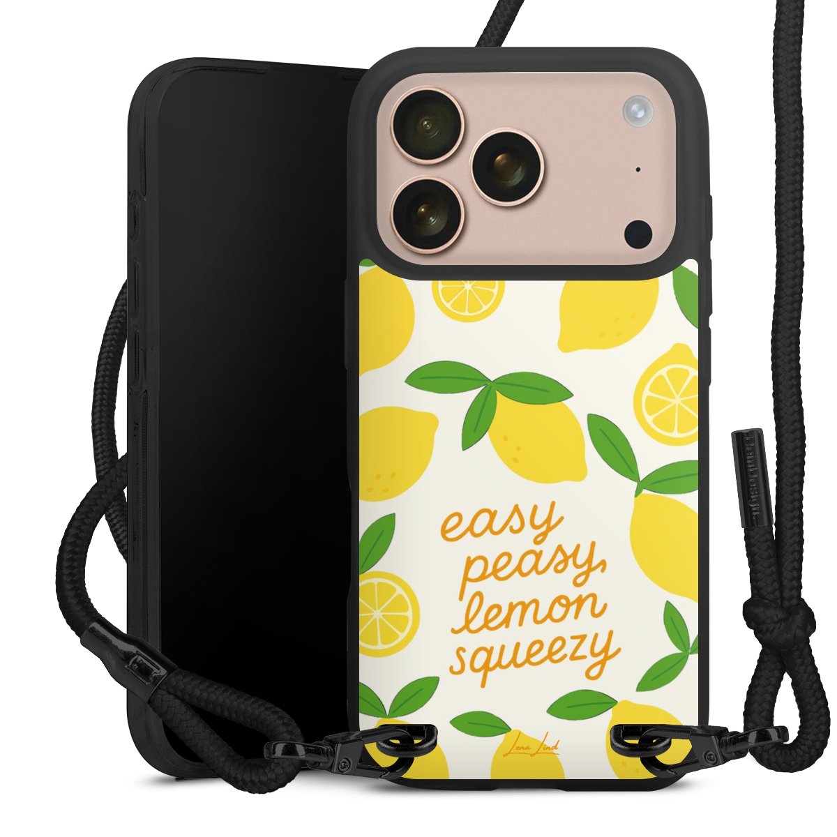 Pure Black: Handyhülle, Stoffband und Metalldetails in stylischem Mattschwarz.