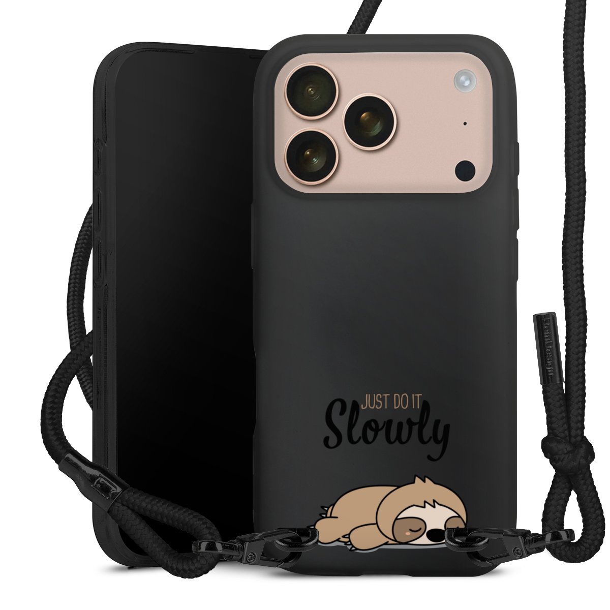 Pure Black: Handyhülle, Stoffband und Metalldetails in stylischem Mattschwarz.