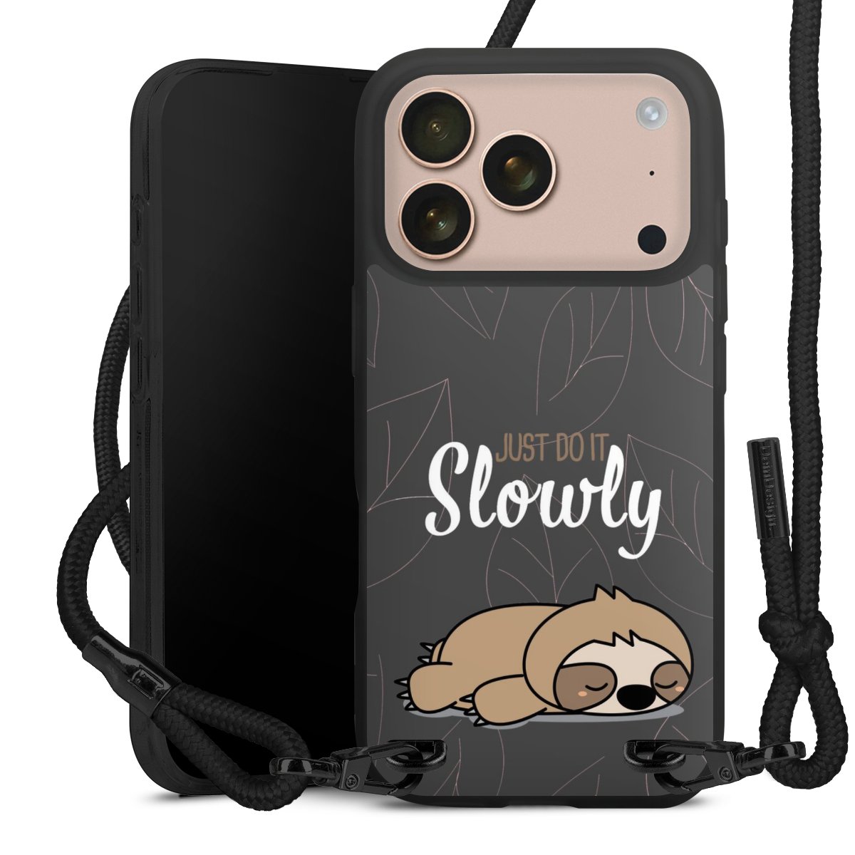 Pure Black: Handyhülle, Stoffband und Metalldetails in stylischem Mattschwarz.