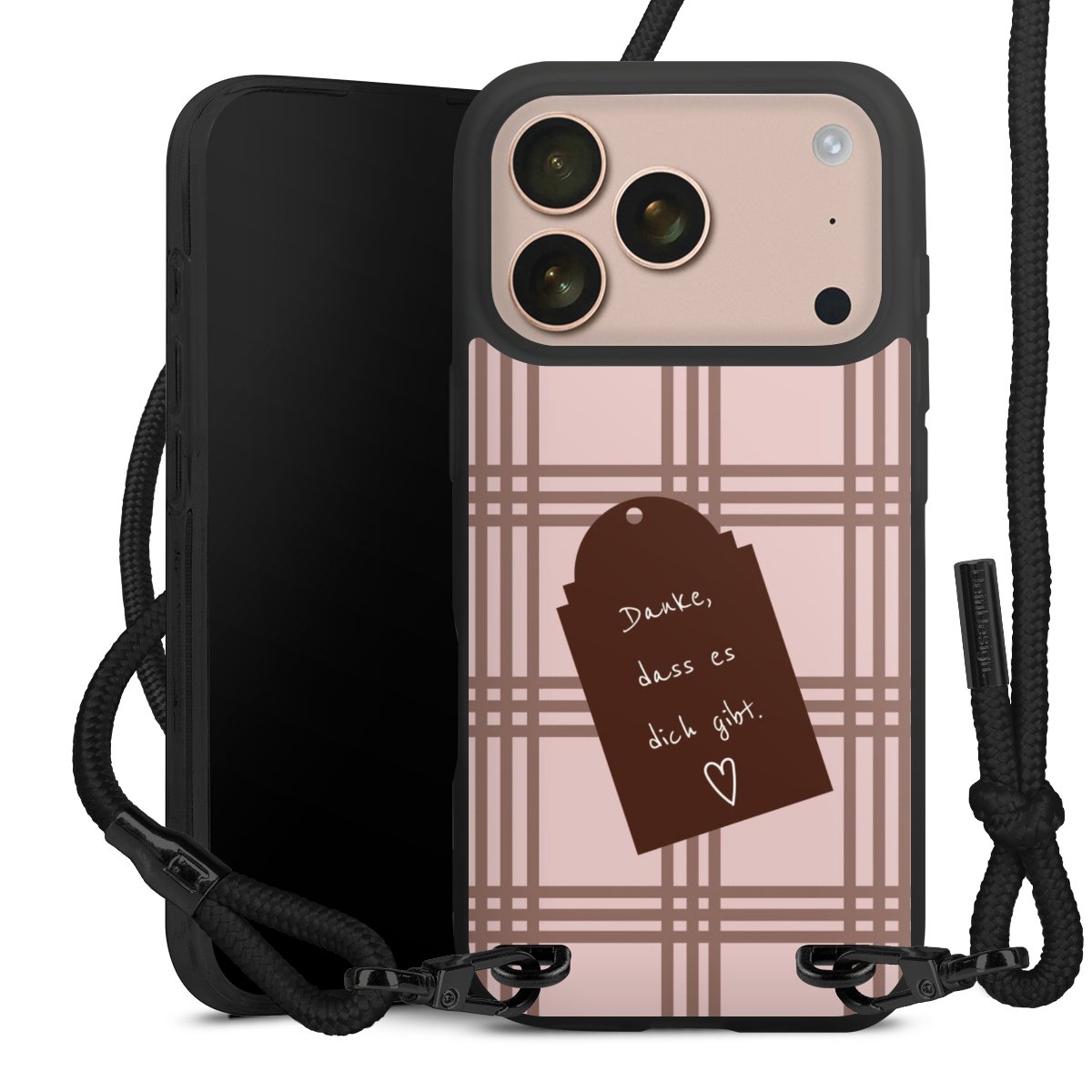 Pure Black: Handyhülle, Stoffband und Metalldetails in stylischem Mattschwarz.