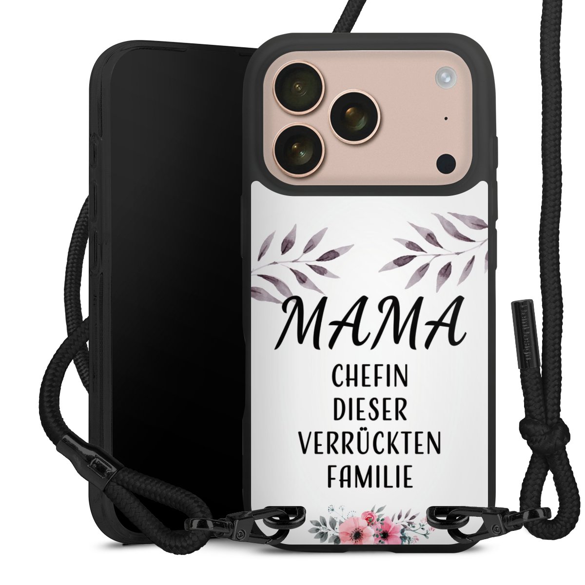 Pure Black: Handyhülle, Stoffband und Metalldetails in stylischem Mattschwarz.