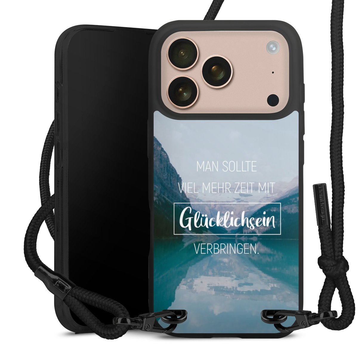 Pure Black: Handyhülle, Stoffband und Metalldetails in stylischem Mattschwarz.
